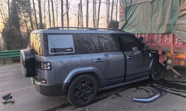 从现场照片来看,方程豹钛7的车头部分嵌入货车尾部,车身右侧有明显碰撞痕迹,地面散落着车辆碎片,但整车A柱保持完好,没有出现弯折或变形。