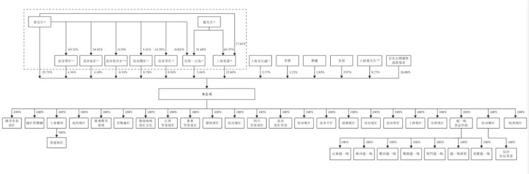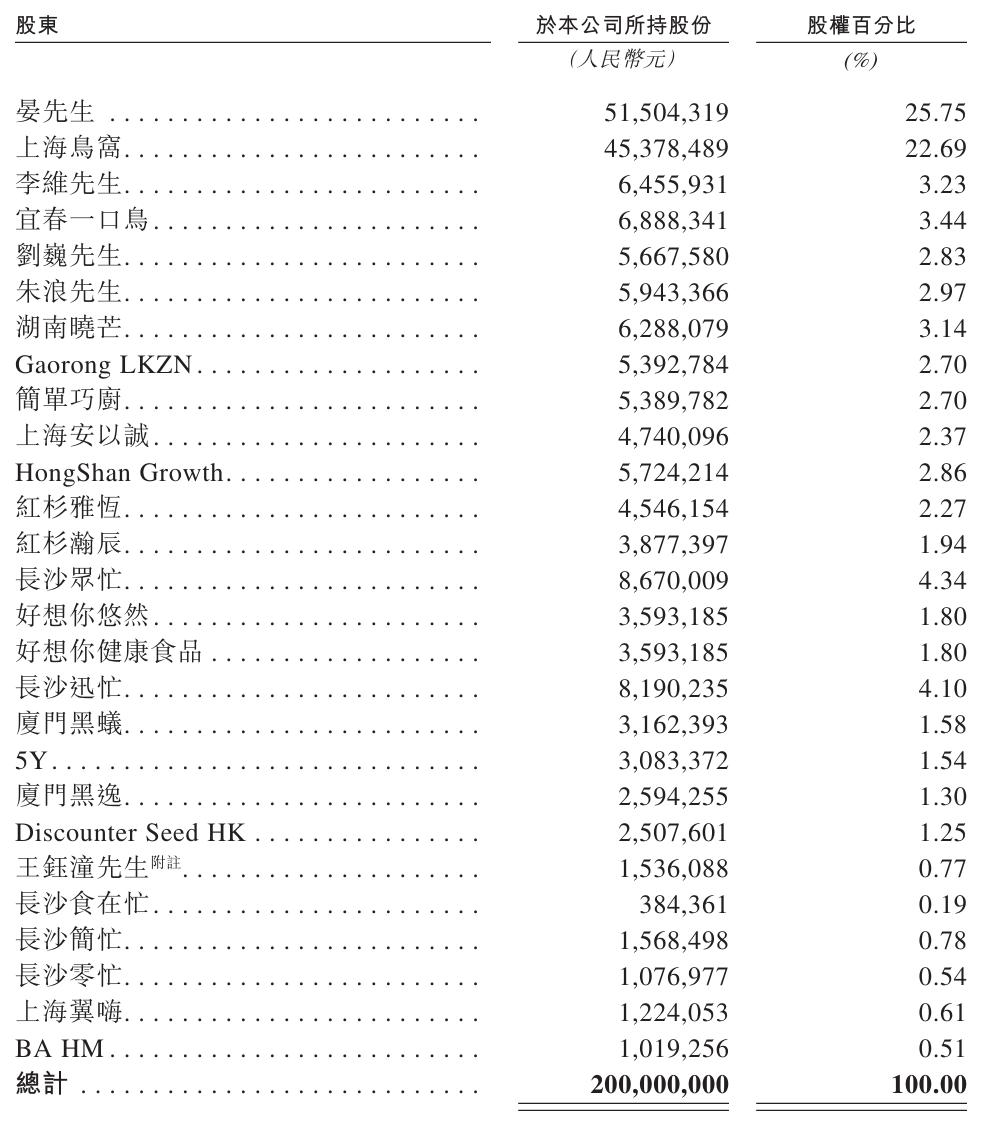 IPO前,晏周持股25.75%,上海鸟窝持股22.69%,李维持股为3.23%,宜春一口鸟持股3.44%,刘巍持股为2.83%,朱浪持股为2.97%,湖南晓芒持股为3.14%,Gaorong LKZN持股为2.7%,简单巧厨持股为2.7%;