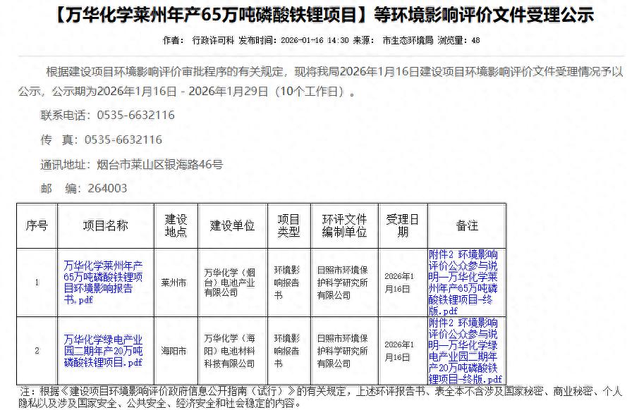 1月16日,万华化学(600309)两大锂电池材料项目——莱州年产65万吨磷酸铁锂项目、绿电产业园二期年产20万吨磷酸铁锂项目环境影响评价文件在山东省烟台市生态环境局受理公示。