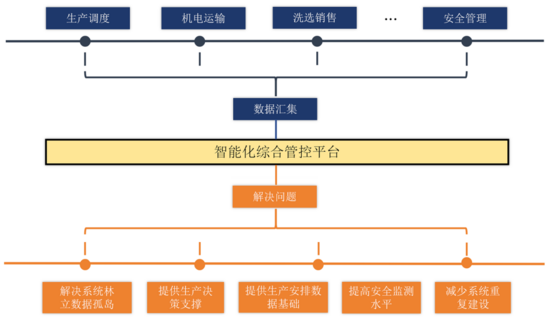 提高智能化项目建设成效,重构项目调研模式。调研人员需长时间、多频次进入生产现场,以一线员工的身份,观察工作过程,并与工作人员深度交流,体会其中的痛点。在完成项目调研后,形成现场详细工作流程图,并在工作流程图中标注过程痛点;形成调研报告,以降低劳动强度、减少工作时间、减少工作人数、改变工作方式等方面的内容。将形成的调研报告与工作流程图作为项目评估的关键资料,在项目可行性研究阶段,邀请现场工作人员对其调研结果进行评估,提升调研质量,防止产生预期偏差,推动项目落地实效。以各智能化矿井较为普遍的智能化综合管控系统为例,系统建设前,各智能化系统分散在各职能部门中,生产中遇到的问题无法通过多系统数据综合分析。因此,智能化建设需以云平台为数据基础,将各系统的关键指标汇聚到统一系统平台进行综合分析,指导矿井生产经营,提高安全监测水平,智能化综合管控平台架构如图2所示。