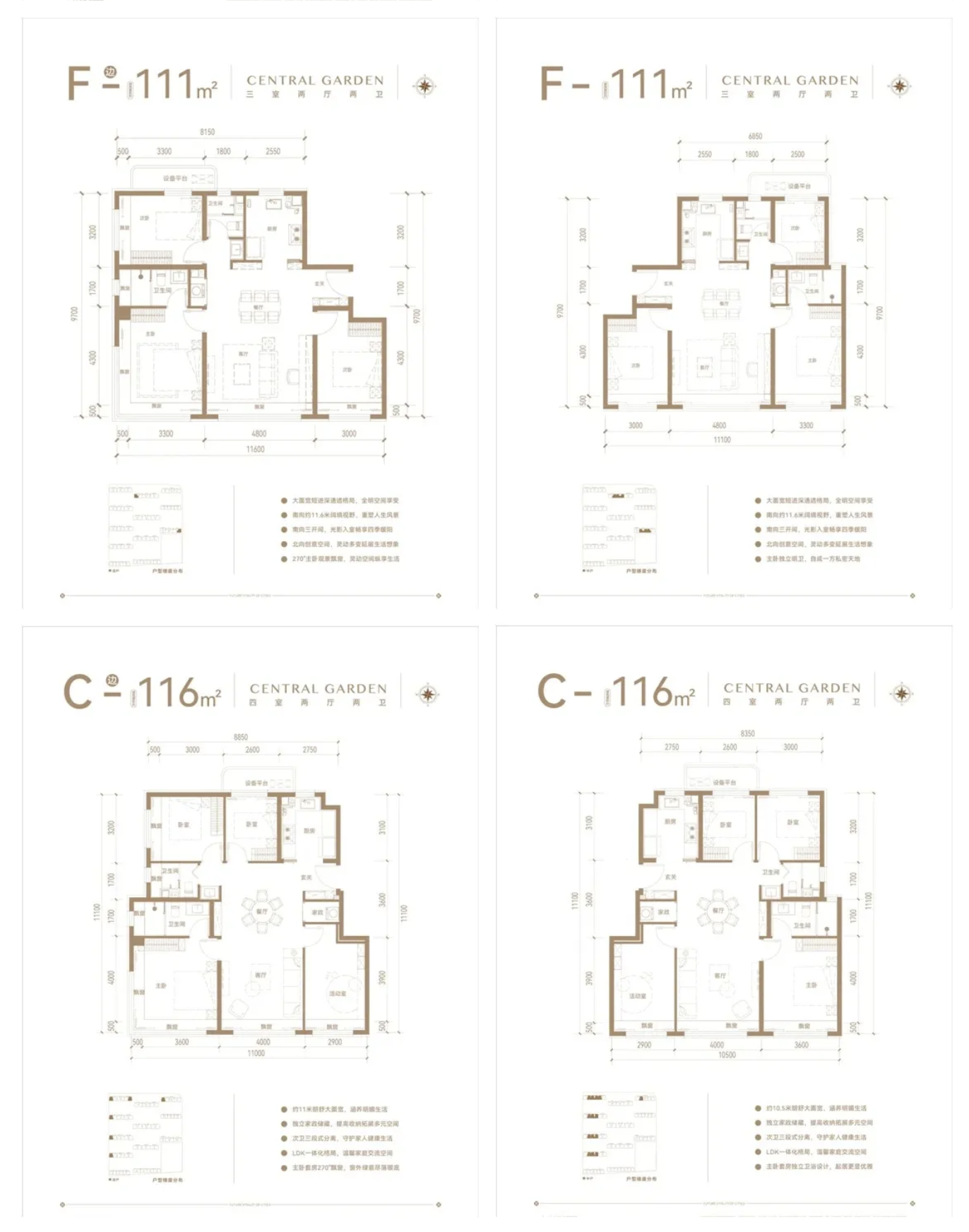 通面宽大飘窗设计,得房率在82%左右,部分118㎡三室两厅户型得房率接近84%。