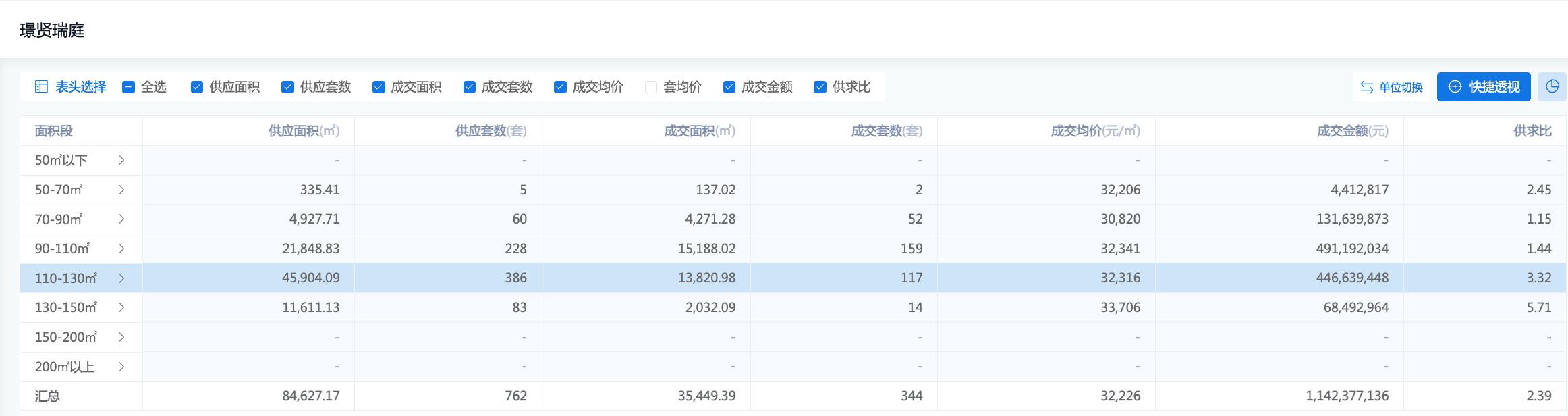 成交面积段来看,110-130㎡建面供应最多,有386套,但是成交并不是最多的,仅有117套,去化三成左右。