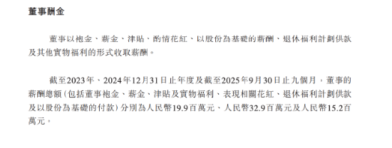 招股书显示,截至2023年、2024年12月31日止年度及截至2025年9月30日止九個月,董事的薪酬总额分別为人民币1990万元、人民币3290万元及人民币1520万元。