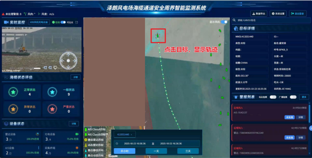目前,该平台已全面覆盖泽朗风电场场区46座海上风机及13条35kV海缆通道,实现全天候、全时段、全方位的智能监控。平台凭借实时监测、智能报警、风险评估和联动处置等核心功能,能精准识别船舶闯入、海缆异常等潜在风险,提前发出预警信号,让风险隐患“无处遁形”,显著提升了风电场的本质安全水平与运行效率,为绿色电力的稳定输送筑牢“安全屏障”。
