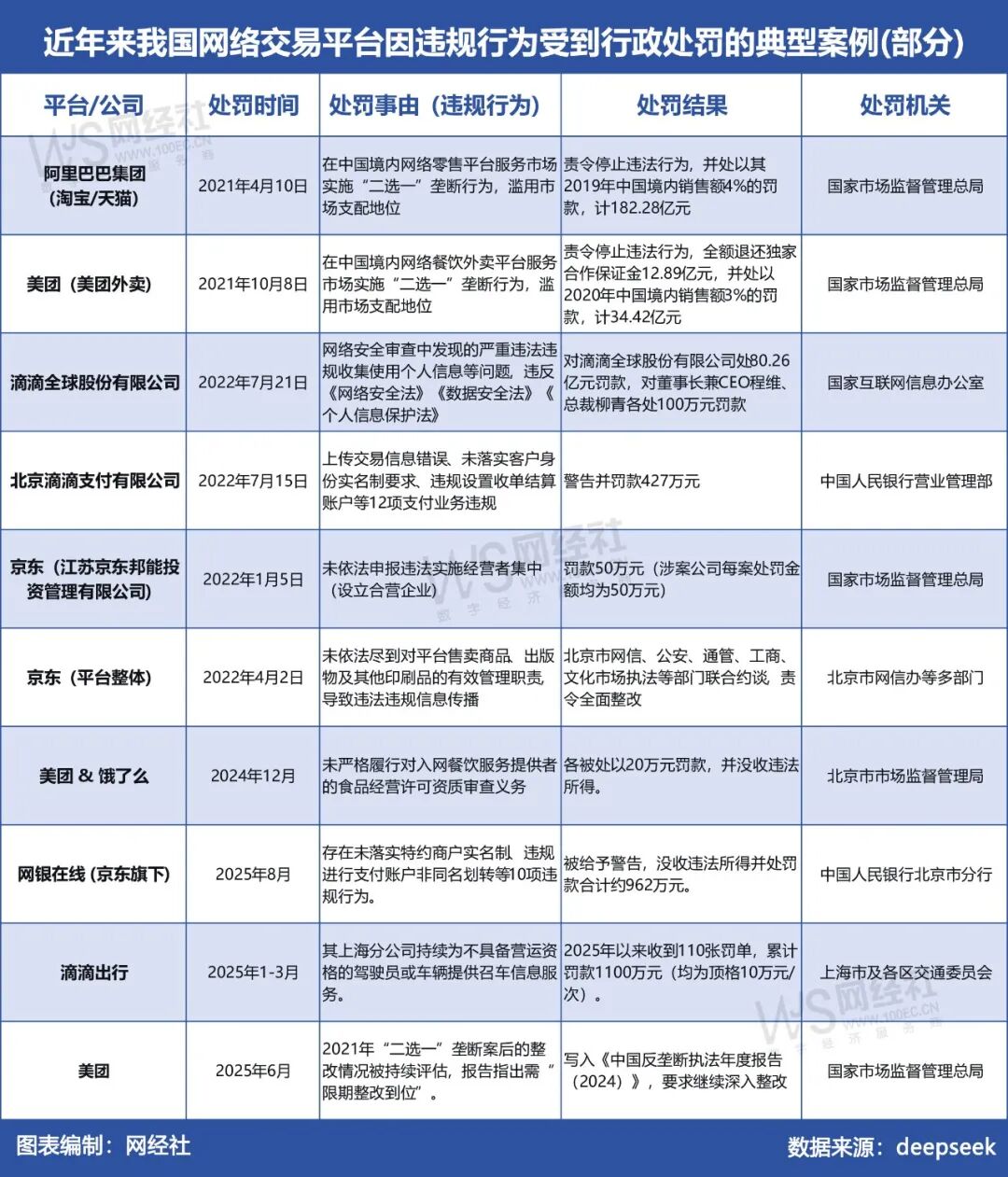 导读:1月7日,市场监管总局和国家网信办联合发布《网络交易平台规则监督管理办法》,针对平台“仅退款”、“会员降权”、“大数据杀熟”等乱象明确划出红线,这意味着那些曾经可以“一言堂”制定规则的平台巨头,将面临更加公平、透明、规范的监管环境。据网经社查询deepseek显示,阿里巴巴、美团、饿了么、滴滴、京东等平台均因违规行为受到行政处罚。