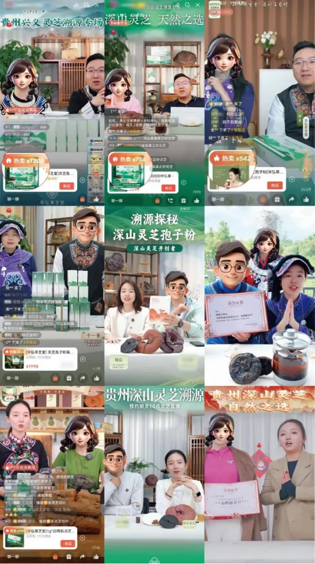 华弘草芝堂以8500亩深山灵芝谷为场景,结合季节与灵芝生长阶段,设计“寻找千年仙草”“守山人日记”等主题,通过高清画面呈现云雾环境、青冈木灵芝生长及破壁过程等场景,让观众直观了解灵芝的生长环境与采摘过程。