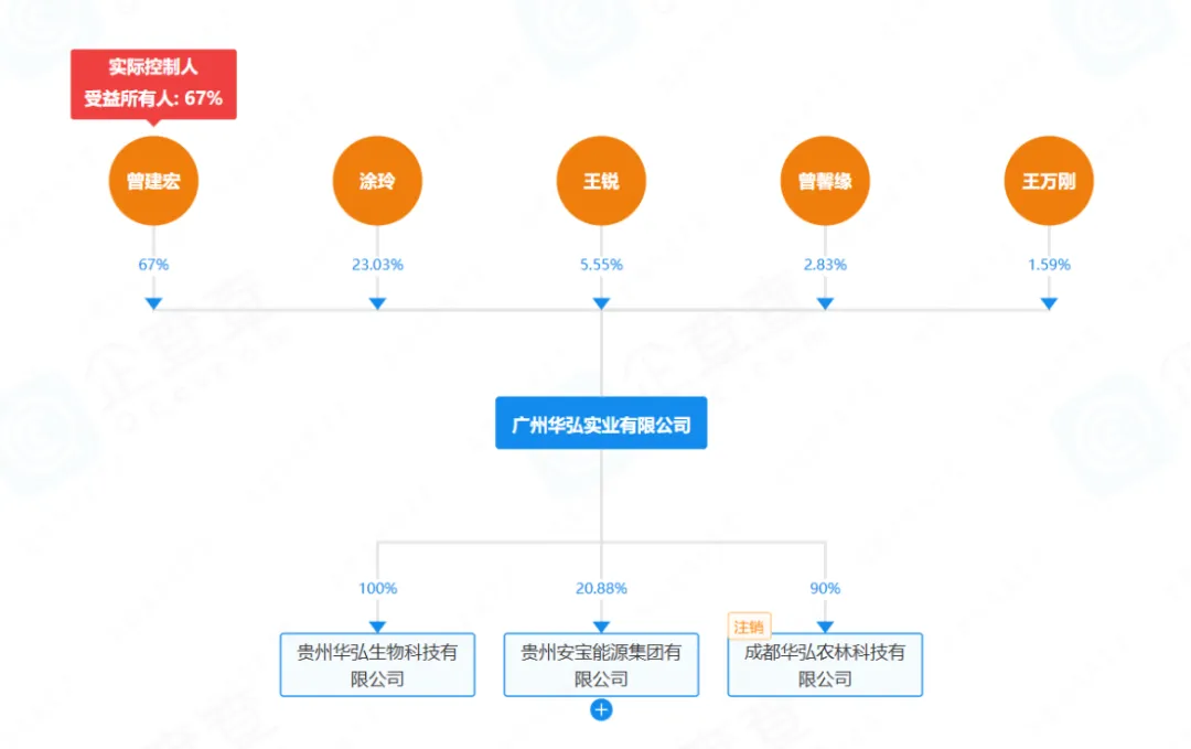 公开资料显示,华弘草芝堂隶属于贵州华弘生物科技有限公司(简称贵州华弘),广州华弘实业有限公司(简称广州华弘实业)持有贵州华弘100%股权,实控人为曾建宏,持股比例为67%。