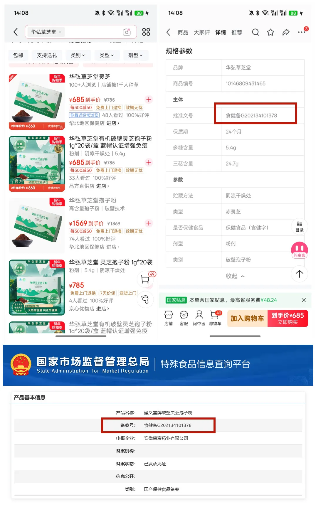 ▲京东上销售的破壁灵芝孢子粉以及其备案信息