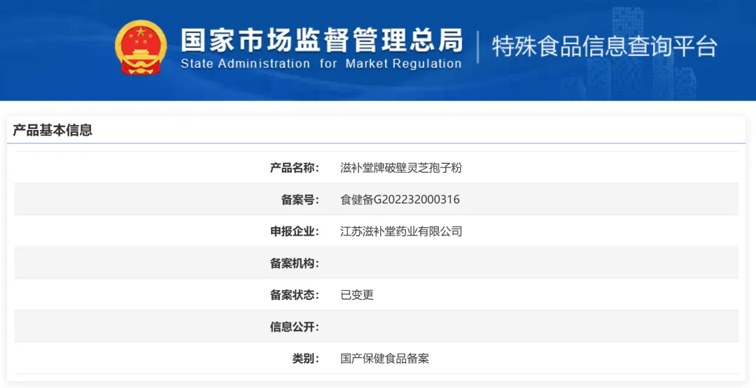 国家市场监督管理总局网站查询到的信息显示,该批号对应的产品名称是“滋补堂牌破壁灵芝孢子粉”,申报企业为江苏滋补堂药业有限公司。