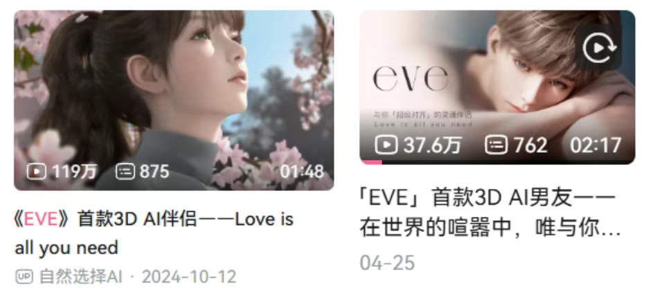 早在2024年,“自然选择”推出的《EVE》3D AI女友视频就在B站播放量超百万,次年推出的AI男友也被广泛热议。