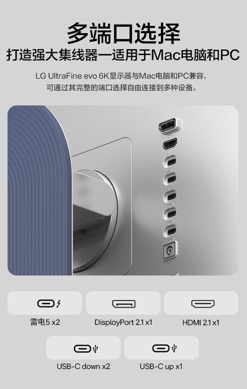 该显示器支架支持升降/倾斜/旋转,内置双 5W 扬声器,配备 2 个雷电 5 接口、1 个 DisplayPort 2.1 接口、1 个 HDMI 2.1 接口,其中雷电 5 接口支持 96W 反向供电,可满足设备快充需求。