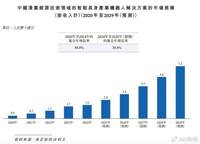 招股书显示,过去五年,中国具身AI机器人是全球市场的核心增长引擎,市场规模从2020年的125亿元增长至2024年的287亿元,复合年增长率达到23.1%。预计到2029年,具身AI机器人的市场规模将达到1101亿元,2024年至2029年的复合年增长率将进一步提升至30.9%。