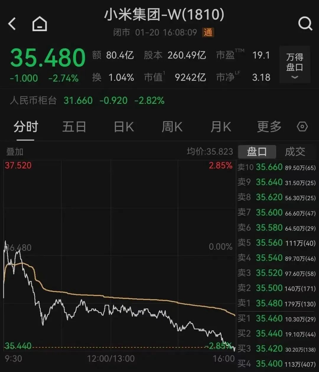 1月20日收盘,小米集团跌2.74%,报35.48港元,创去年1月27日以来新低。彼时,小米股价一路震荡上行,于2025年6月底达61.45港元,区间涨幅为63.21%。随着新一轮下跌,截至今日收盘,小米集团已吐回上述全部涨幅,市值距高点缩水6764亿港元。