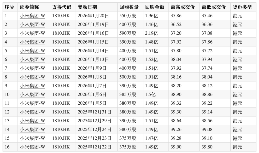 同日晚间,小米集团-W在港交所公告,公司于2026年1月20日,通过集中竞价交易回购550万股,回购金额1.96亿港元,最低成交价为35.46港元,最高成交价为35.86港元;近30日累计回购6685万股,累计回购金额25.47亿港元。
