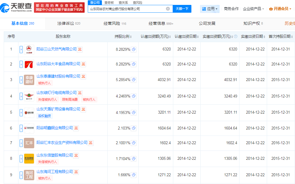 股权结构方面,山东阳谷农商银行第一大股东分别为阳谷三山天然气有限公司、山东阳谷大丰食品有限公司,认缴资本相同。此外,该行的多家股东曾被列为被执行人、失信被执行人,比如,山东绿灯行电缆有限公司、山东东信塑胶有限公司均为失信被执行人、限制高消费企业。