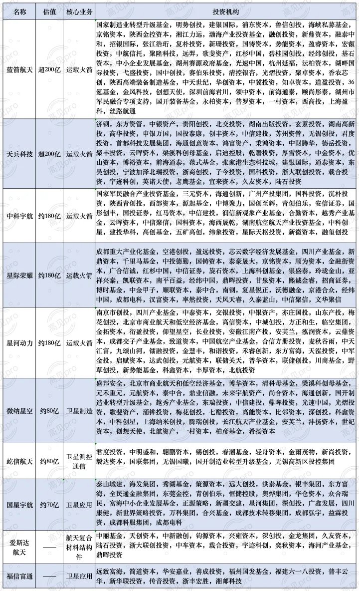 截至目前,商业航天领域推进IPO进程的代表性公司的估值、核心业务,以及投资人(据不完全统计)详情如下: