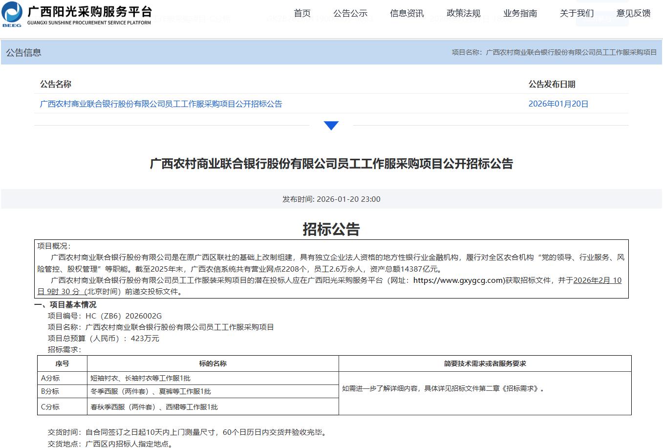 广西农村商业联合银行股份有限公司员工工作服采购项目