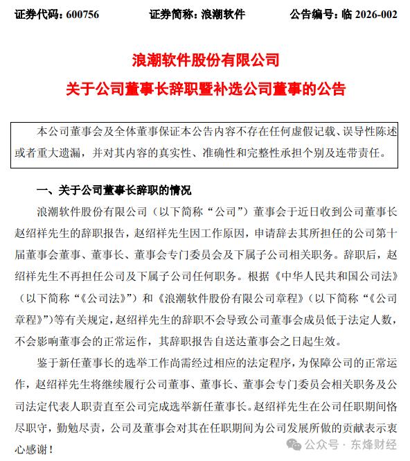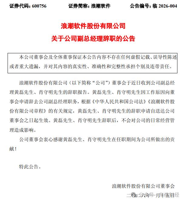 据浪潮软件(600756.SH)1月15日公告,公司董事长赵绍祥、副总经理黄磊、副总经理肖守明同时辞去在上市公司所有职务。此前浪潮软件发布2024年年报显示,三人任期终止日期为2026年5月5日。