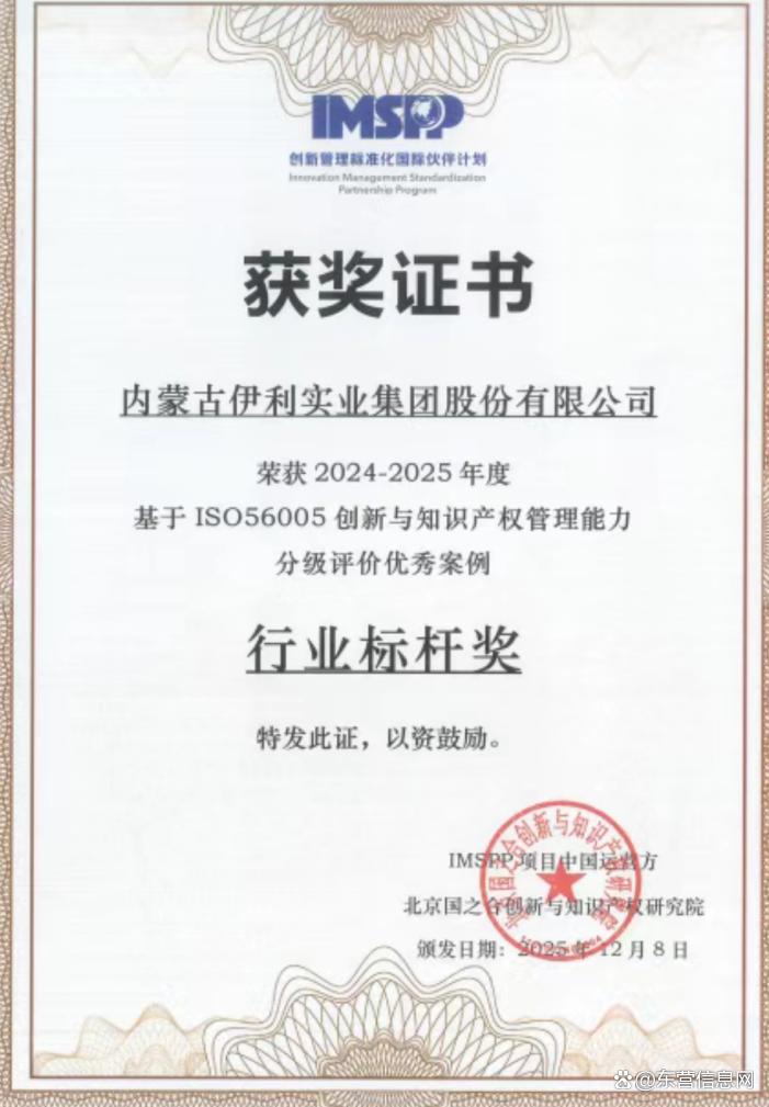 在创新驱动发展的时代浪潮中,企业如何凭借知识产权构筑坚不可摧的核心竞争力近日,伊利股份以一份沉甸甸的国际荣誉,为行业提供了标杆答案。在2025年度由ISO 56005国际标准中国运营方组织的“创新与知识产权管理能力分级评价优秀案例”全国评选中,伊利股份脱颖而出,荣膺食品行业唯一的“行业标杆”奖。成为全国创新与知识产权管理能力建设的一面旗帜,树立食品行业创新管理新标杆。