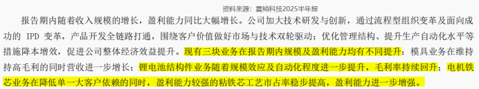 至于毛利率提升的原因,震裕科技在2025半年报中已有所提及: