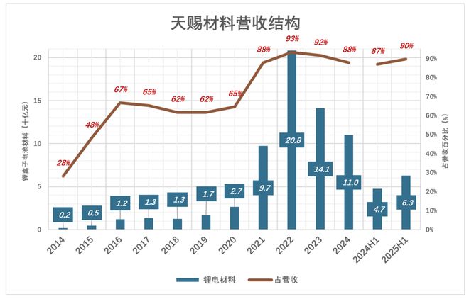 2016年,电池材料收入占比突进到60%以上;……………… 2021年,电池材料收入占比达到90%一线: 2021年,收入97亿、占营收的88%; 2022年,收入208亿、占营收的93%; 2023年,收入141亿、占营收的92%; 2024年,收入110亿、占营收的88%; 2025年H1,收入63亿、占营收的90%;