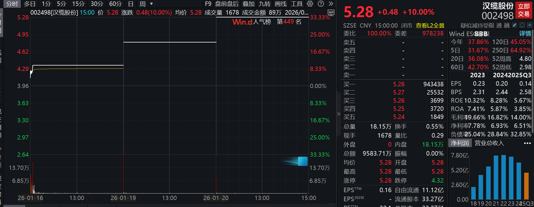 1月16日至1月20日,鲁股汉缆股份(002498.SZ)走出三连板行情。截至1月20日收盘,该股上涨10%,报收于5.28元/股,全天换手率0.55%,成交量18.15万手。