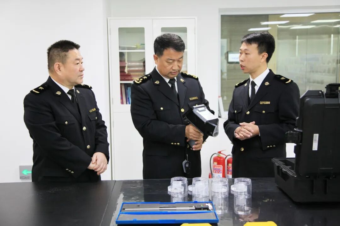 天津海关关长靳延勇(中)到天津海关科技大楼归类化验实验室调研