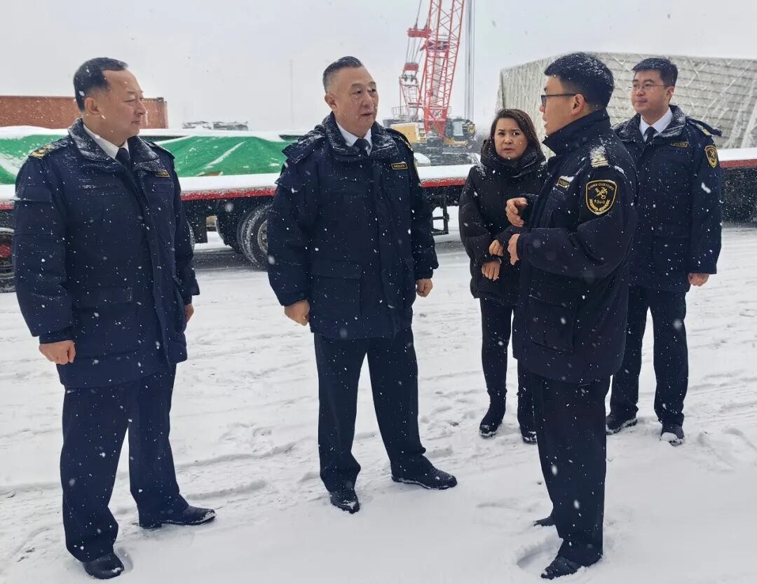 1月8日,乌鲁木齐海关关长郝炜明(中)在霍尔果斯开展专项工作指导