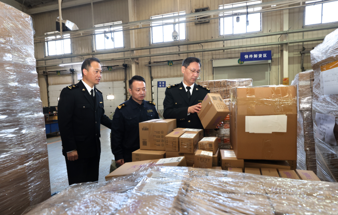 长沙海关关长顾炯(右一)在调研进境邮快件监管工作