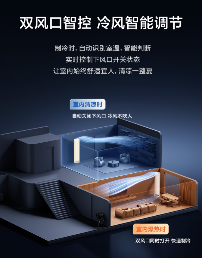 产品搭载国际领先的分布式送风技术实现“底部出风、正面无风感”,风速仪实测正面风速低于0.3m/s,从地面到1.8米高度的垂直温差不到1.5℃,彻底告别“头热脚冷”的传统痛点。内机最低噪音16dB(A),远低于图书馆40分贝环境噪音。产品还具备65℃高温制冷能力,在极端高温环境下依然稳定运行。