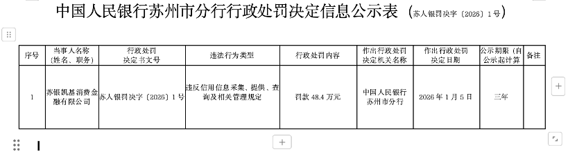 在中信消金领罚的五天后,1月14日中国人民银行苏州市分行也公布了一则行政处罚决定,苏银凯基消费金融因违反信用信息采集、提供、查询及相关管理规定,被处以48.4万元罚款,罚单同样公示三年。