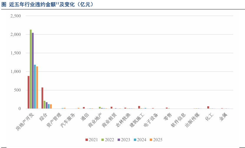 从违约金额来看,近五年民营房地产行业违约仍是主流,2025年房地产开发行业违约金额虽然已经连续三年下降,但仍占到了违约总金额的84.25%。其次违约金额较大的行业为综合类行业(主要是“当代系”、杉杉集团等),此外资产管理行业和汽车服务行业违约金额较大,资产管理行业违约主体为国厚资产管理股份有限公司,违约金额21.88亿元。汽车服务行业违约主体为广汇汽车服务有限责任公司,违约金额21.17亿元。此外2025年建筑施工行业债券违约金额有所下降,2025年新增违约主体欣捷投资,目前已完成兑付。