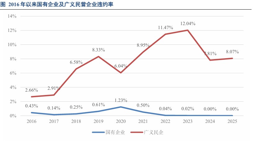 从企业性质来看,我们分为国有企业(地方国有企业和中央国有企业)以及广义民企(除国有企业外的所有企业)。从下图可以看出,2025年广义民企违约率小幅抬升,仍处于较高水平,而国企违约率持续下降,2025年国企违约率降为零。2023年国企违约主要是武汉当代明诚文化体育集团股份有限公司以及天津市房地产信托集团有限公司违约;2024年新增岭南生态文旅股份有限公司可转债发生违约。