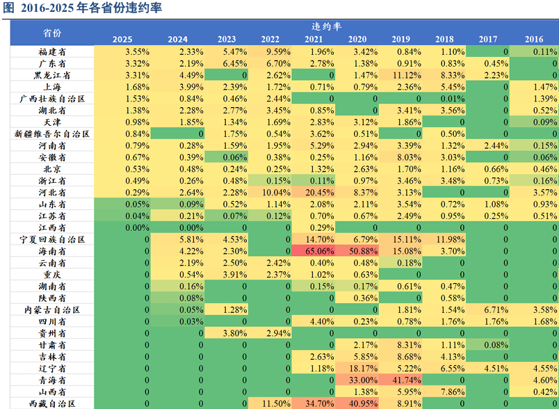 2025年,违约率较高三大省份分别为福建省、广东省和黑龙江省,违约率分别为3.55%、3.32%和3.31%,较2024年(宁夏、黑龙江和海南)减少了宁夏和海南;其次为上海(1.68%)和广西省(1.53%),前五大违约省份中福建、广东和广西的违约率较2024年有所提升。此外违约率在1%以上的湖北省,违约率在0.5%-1%的有天津、新疆、河南、安徽和北京。此外有7个省份近两年保持零违约率,分别为贵州省、甘肃省、吉林省、辽宁省青海省、山西省和西藏,但这几个省份并非安全地带,甚至曾是违约的重灾区,尤其区域内的民营企业,只不过随着省内民营企业陆续出清,新增违约下降,违约率降至零。