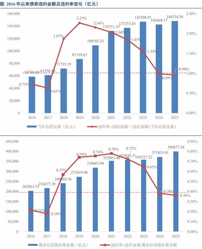 从2016年以来信用债违约率变化来看,继续采用两种方法计算违约率,一种是当期违约率,以违约金额比当年总偿还金额加违约金额计算;另一种为存量违约率,以违约金额比当年期末信用债余额计算。在债券违约金额2021年达到顶峰而后逐年下降的情况下,近年来的违约率表现如下:第一种计算方法下,债券违约率在2019年(2.27%)达到顶峰后呈现下降趋势,2024年降至1%以下,接近2018年水平,2025年下降0.03个百分点至0.96%;第二种计算方法下,2021年达到违约率最高峰的0.78%,而后逐年下降,2025年继续下降至0.36%,较2021年折半。整体来看,两种计算方法下,2022年后债券违约率呈现下行趋势,从降幅来看,2025年两种计算方法下,违约率降幅均显著放缓。