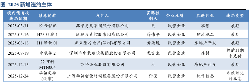 2025年新增违约主体6家,随着房企的陆续出清,较2024年(18家)大幅下降,但也注意到新增违约主体仍以房地产及相关行业(建筑施工、建材)为主。2025年新增2家房地产开发违约主体,分别为万科企业股份有限公司(以下简称“万科”)、正兴隆房地产(深圳)有限公司(以下简称“正兴隆”),房地产行业上游新增违约建筑施工企业1家,欣捷投资控股集团有限公司(以下简称“欣捷投资”),下游建材新增违约1家深圳市中装建设集团股份有限公司(以下简称“中装建设”);此外还有零售企业1家,苏宁易购集团股份有限公司(以下简称“苏宁易购”)和软件信息企业1家上海华铭智能终端设备股份有限公司(以下简称“华铭智能”)。其中,中装建设和华铭智能均为转债违约。