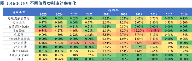 2016年以来,债券违约(指当年的所有违约,不仅是新增主体违约)类型涉及短融、一般公司债和企业债、中票、ABS、ABN、可交换债、私募债以及定向工具,此外2024年新增多支可转债违约。截至2025年末,项目收益票据和银保监会主管ABS仍保持“零”违约的记录,近四年一般短期融资券和一般企业债也未发生违约。2025年,违约金额前三大的债券类型为一般公司债、私募债和证监会主管ABS,占违约总金额的比例分别为67.34%、14.63%和7.31%,违约率分别为6.16%、0.99%和0.88%。从违约率来看,前三的债券类型分别为可交换债、一般公司债和私募债,2025年违约率分别为9.54%、6.16%和0.99%,前两者违约率均较2024年增加。