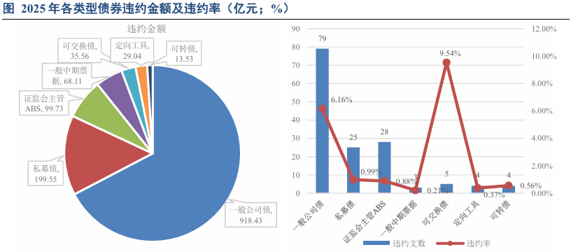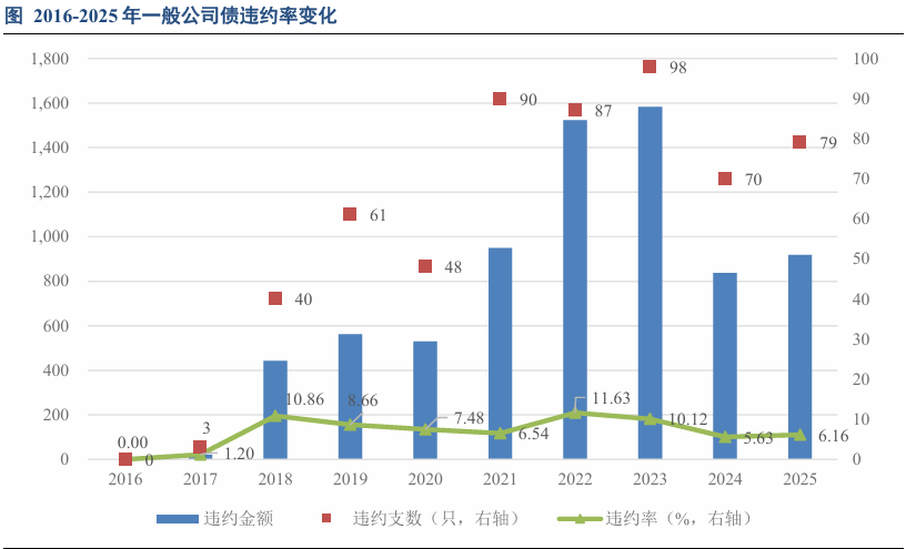 一般公司债受民营房地产违约影响,违约率一直处于高位波动。2023-2025年房企违约的公司债占公司债违约金额的92.28%、88.92%和92.00%。随着房地产企业陆续出清,近两年违约金额显著下降,但违约率仍处于较高水平。