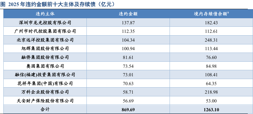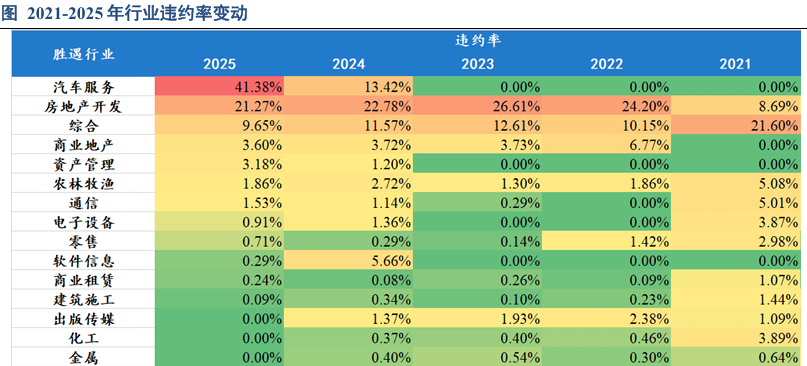 从违约率来看,汽车服务和房地产开发行业表现较差。其中,2022-2025年房地产开发行业违约率持续在20%以上,也拉高了整个债券市场尤其是广义民企的违约率,2025年新增民营房地产万科和正兴隆违约,其中万科境内存量债规模高达160.98亿元,随着存续债相继到期,未来房企出清仍在继续。2025年汽车服务行业违约率高达41.38%以上,汽车服务行业主体数量较少,偿还量逐年下降,而自2024年“广汇系”主体违约,汽车服务行业违约率激增。此外综合类行业违约率仍较高,综合类企业业务较为多元化,但同时也表现出单一行业业务竞争力不强,主业不突出等弊端,违约率一直处于较高水平,近几年主要是“当代系”主体,杉杉集团、新紫光集团有限公司以及海航集团有限公司等。此外商业地产和资产管理行业违约率在3%以上,其中商业地产主要是红星美凯龙控股集团有限公司和哈尔滨工新科技股份有限公司违约,资产管理行业为安徽省国厚资产管理股份有限公司违约。农林牧渔和通信行业违约率也略高,其中农林牧渔行业违约主体为此前已发生过违约的雏鹰农牧集团股份有限公司,通信行业违约主体为富通集团有限公司和鹏博士电信传媒集团股份有限公司。