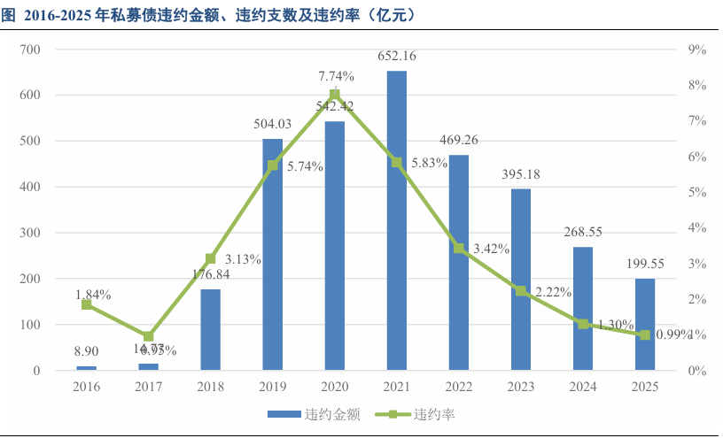 2021年以来私募债违约金额和违约率逐年下降。私募债违约率在2020年高达7.74%,2022年及以后违约金额和违约率均呈逐年下架,截至2025年,私募债违约率已降至1%以下,且近几年违约金额占比最高的依旧是房地产企业。
