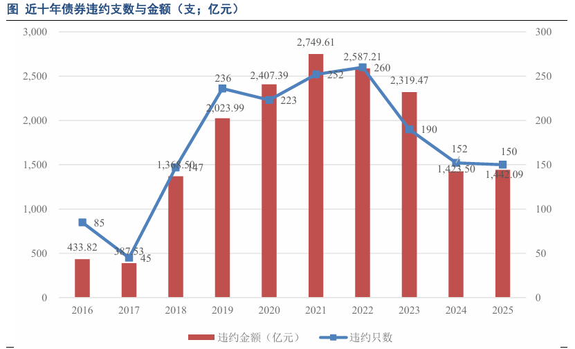2025年全年发生债券违约的主体合计52家,较上年(67家)减少了15家;违约债券 150只,较上年(152只)减少了2只,违约金额合计1,442.09亿元,同比微增1.31%,在连续三年下降后小幅反弹。整体来看,违约金额与去年相比相差不大,违约主体数量呈现一定下降。