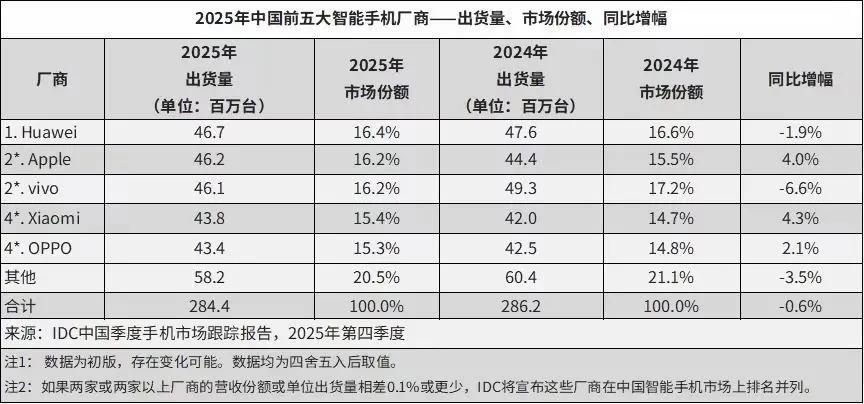 2026年1月14日IDC发布的《全球季度手机跟踪报告》,为2025年中国智能手机市场画上了句点。