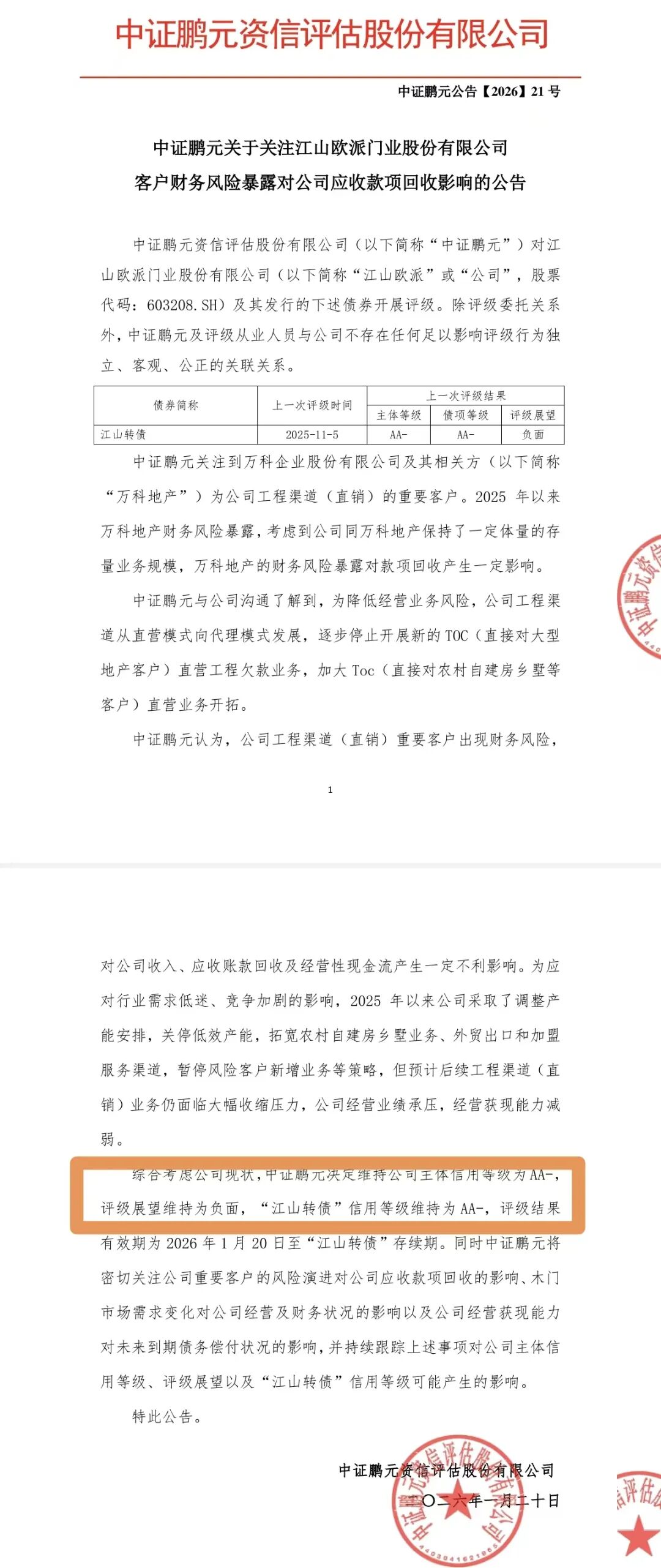 因发行人公司渠道的重要客户包含万科及其相关方,考虑到万科地产财务风险暴露,对发行人应收款项存在一定影响,同时综合考虑公司其他方面的情况,决定维持发行人主体评级AA-,展望负面。