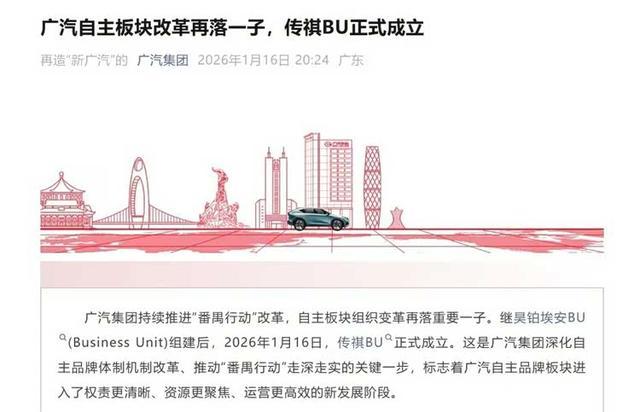 1月16日,广汽集团宣布传祺BU成立。这是继昊铂埃安BU组建后,广汽集团推进“番禺行动”改革、深化自主板块组织变革的又一关键举措。