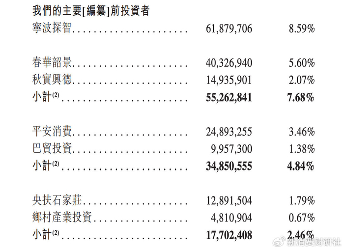 红杉中国通过宁波探智持股61,879,706股,占比8.59%;春华资本通过春华韶景、秋实兴德合计持股55,262,841股,占比7.68%;平安投资通过平安消费、巴贸投资合计持股34,850,555股,占比4.84%;其他重要投资者为央扶石家庄、乡村产业投资、博佳系资本、厚生投资、茅台金石等合计持股占比约38.69%。