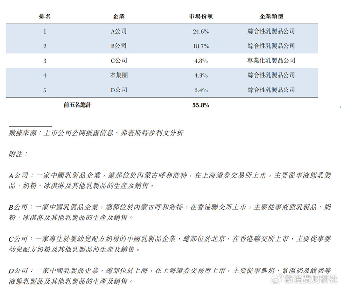 根据弗若斯特沙利文的资料,按2024年零售额计算,君乐宝位列中国第四大乳制品公司,并成为仅次于伊利和蒙牛的中国第三大综合性乳制品公司,市场份额为4.3%。