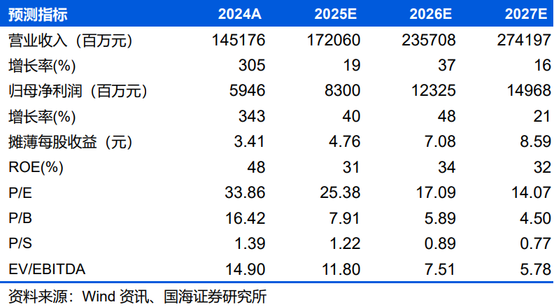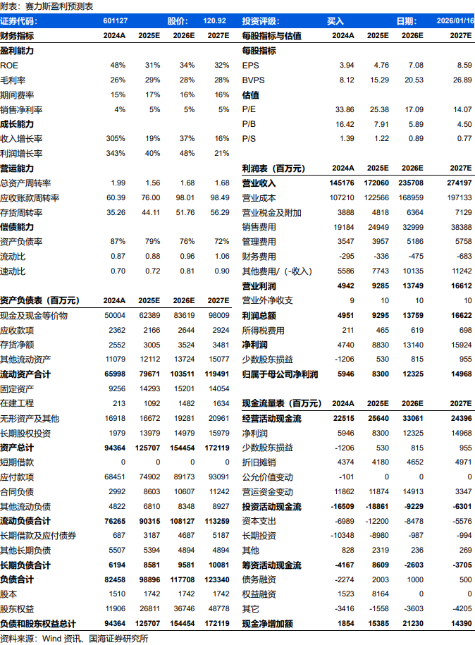 受益华为赋能,公司旗下问界高端化车型精准定位高净值客户人群,成功打造M9、M8等高端车型。根据最新情况,我们调整公司2025~2027年营收预测为1,721、2,357、2,742亿元,同比增速为19%、37%、16%;实现归母净利润83.0、123、150亿元,同比增速为40%、48%、21%;EPS 为4.8、7.1、8.6元,对应当前股价的PE估值分别为25、17、14倍。鉴于公司2026年新车及改款车型有望复刻其爆款逻辑,上调至“买入”评级。