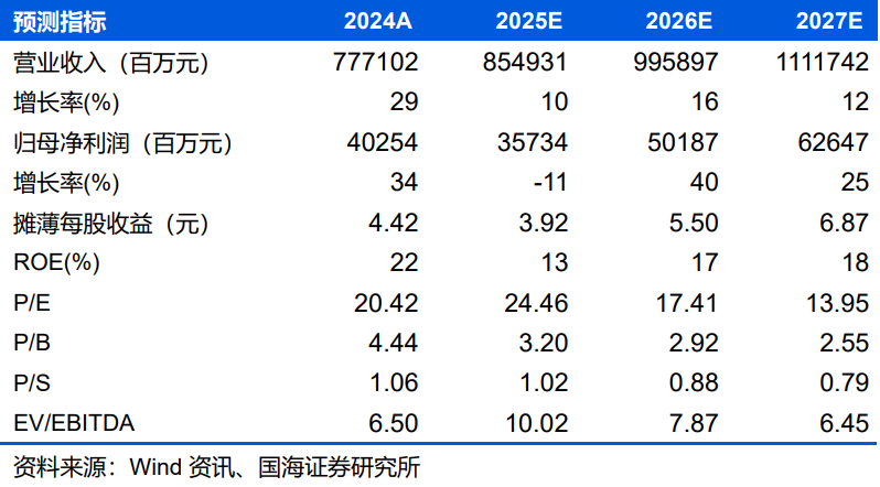 基于公司最新销量情况,我们将公司2025~2027年营收预测调整为8,549、9,959、11,117亿元,同比增速为10%、16%、12%;预计公司2025~2027年实现归母净利润357.3、501.9、626.5亿元,同比增速为-11%、40%、25%;EPS 为3.9、5.5、6.9元,对应当前股价的PE估值分别为24、17、14倍,考虑2026年新一轮产品周期,以及出海继续高增,维持“买入”评级。