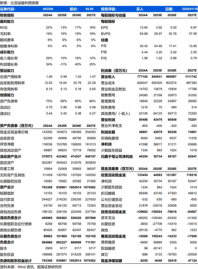 出海表现亮眼,巩固在海外新能源汽车市场的领先地位。比亚迪2025年12月海外销量13.32万辆,同环比+133.0%/+0.9%,全年海外销量突破百万辆,达104.96万辆,同比+145%,成为全球新能源车市场销量冠军。海外业务是比亚迪重要增长引擎,公司在2026年海外市场,销量有望继续实现高增。并凭借规模优势强化零部件采购能力,进一步提升价格竞争力,巩固全球市场地位。