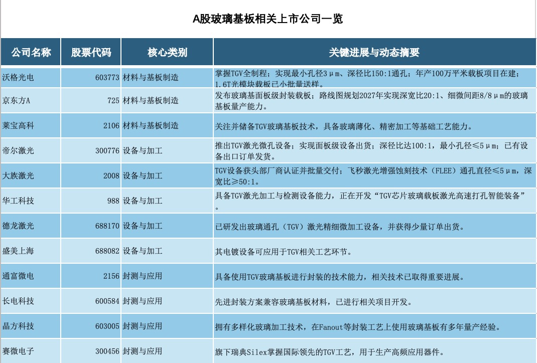 从产业链各环节看,材料端,高纯石英砂、特种玻璃等关键原材料的研发与生产受到重视,国内企业正在该领域持续投入;设备端,国内激光设备厂商,如帝尔激光,已将TGV激光微孔设备作为研发和拓展方向之一;基板制造端,沃格光电等企业正投资建设玻璃基板产线,推动技术产业化;封测端,国内封测龙头企业正积极布局。通富微电已宣布具备玻璃基板(TGV)封装技术并开始小批量生产;长电科技的先进封装技术平台也已兼容玻璃基板材料。